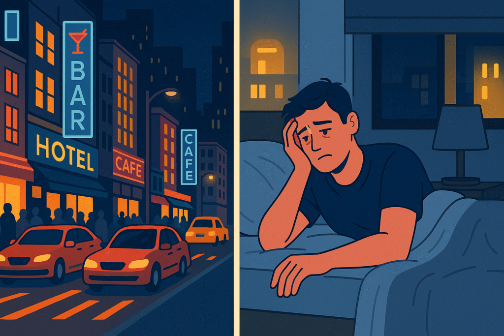 - Artificial light: Streetlamps, digital billboards, and passing headlights disrupt the body’s natural rhythm.