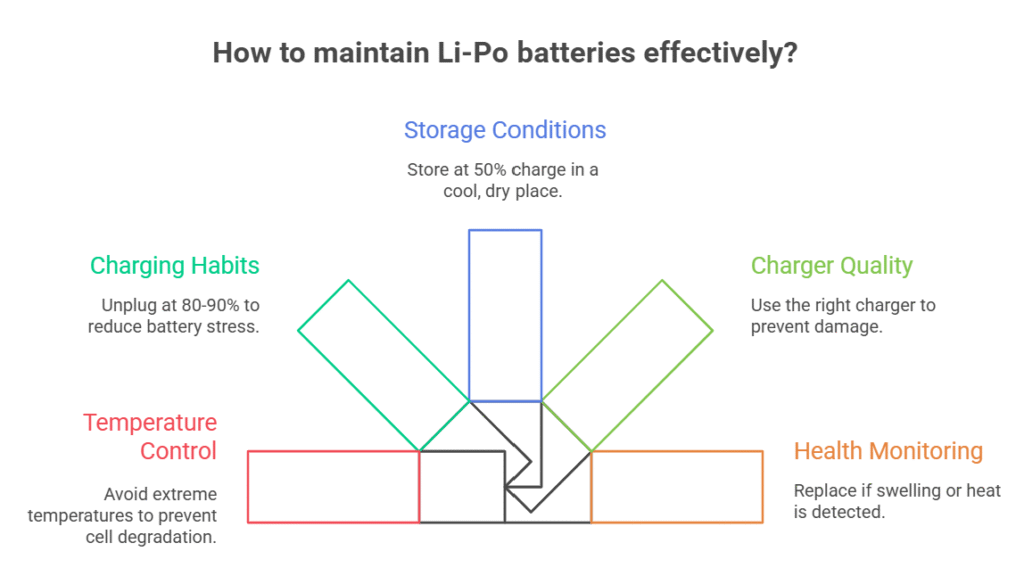 - Storage Matters: Store Li-Po batteries at 50% charge in a cool, dry place.